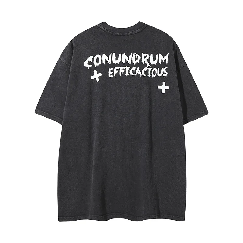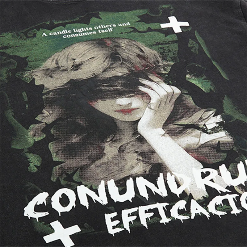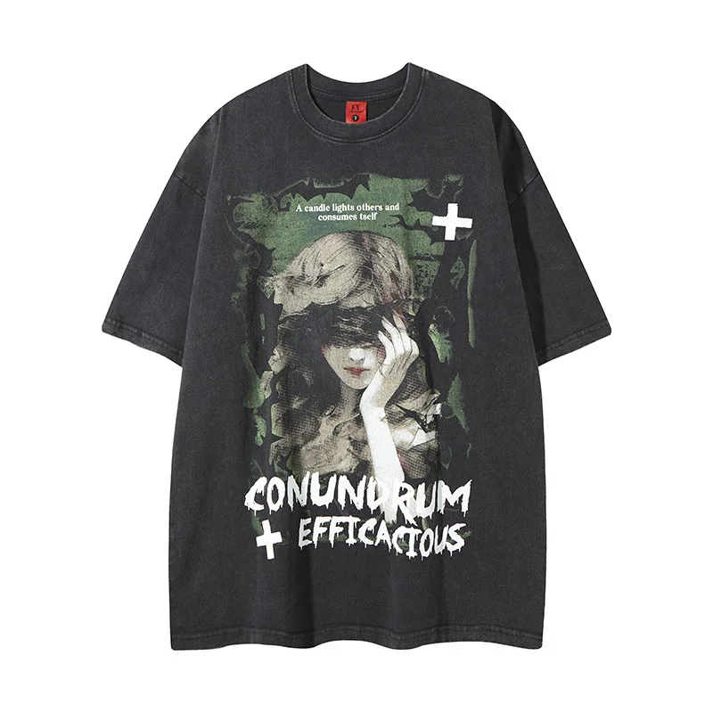 High Street Trendy Distressed Washed 100% Cotton T-Shirt Loose Fit Top Men’s Short Sleeves Girl Pattern Printed O-Neck T-Shirt