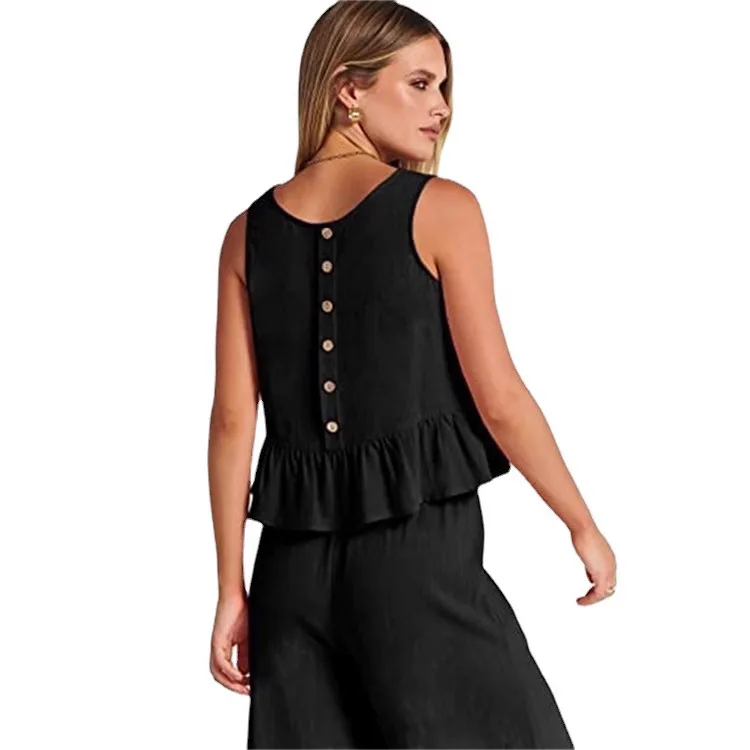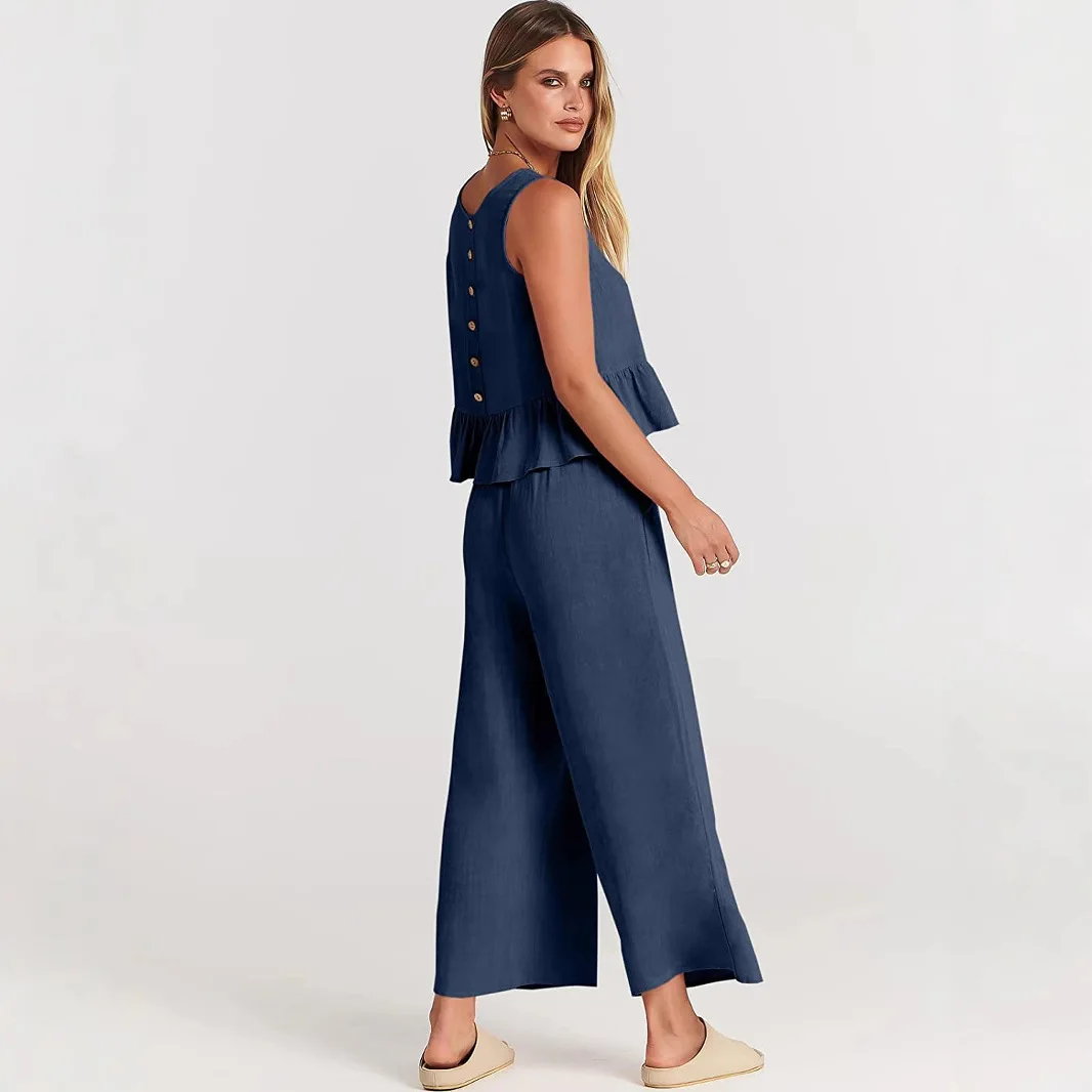 Women’s Floral Nine-Point Pants Shorts Set Sleeveless Pleated Vest and Wide Leg Pants Loose Fit Sports Wear Knitting Fabric